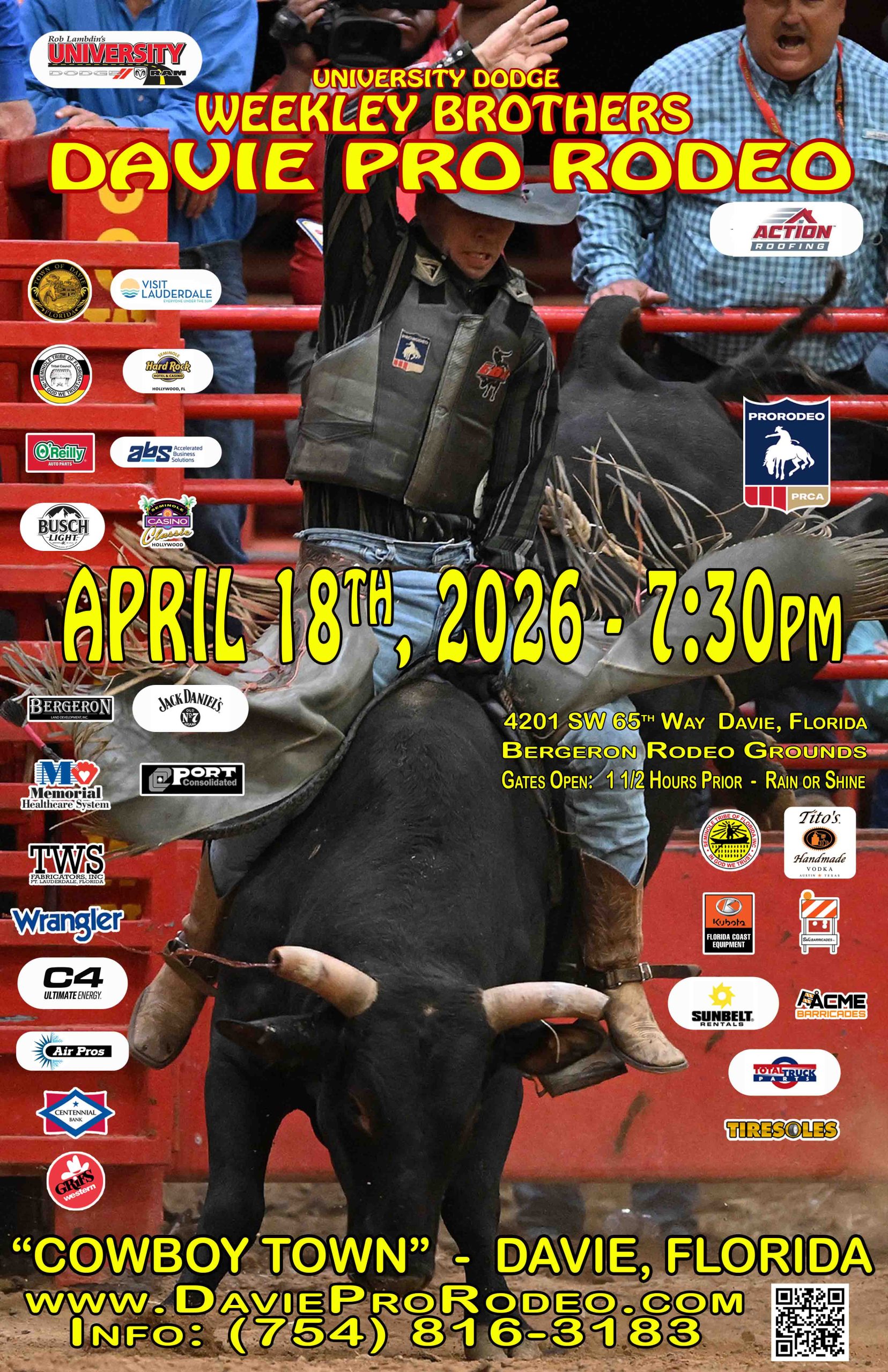If the Davie Arena could talk it would tell some tall stories!! From the birth of Five Star Rodeo in “1986″ to the transition into the Weekley Brothers Davie Pro Rodeo in “2007″. The Nationwide Fame of our Rodeo’s keeps the world travelers as well as the local community, coming back. We feel we have created the best western entertainment that can be seen, with over 280 sanctioned Rodeo’s during the time frame. We have seen top livestock as well as the top Cowboys and Cowgirls compete for National Championship points. In “2009″ the Seminole Tribe of Florida became the Presenting Sponsor of the Southeastern Circuit Finals Rodeo. In addition a host of National and Local Sponsor’s joined the Weekley Brothers Davie Pro Rodeo in ensuring the Southeastern Circuit Finals Rodeo is one of the biggest Rodeo’s in the Nation. The Weekley Brothers Davie Pro Rodeo has shown a commitment to excellence by being nominated two times Professional Rodeo Cowboys Association, Rodeo of the Year in 2002 and 2004. The Weekley Brothers Davie Pro Rodeo was voted the #1 Rodeo in the State of Florida in 2010. In 2019 the Weekley Brothers Davie Pro Rodeo was listed as the #5 Rodeo in the Nation and was also chosen #8 Rodeo Nationally in the USA Peoples Choice Awards. In 2020 the Weekley Brothers Davie Pro Rodeo was named the BEST Rodeo in North America in the USA Today 2020 Readers Choice Awards. All of us at the Weekley Brothers Davie Pro Rodeo hope to see you and your friends in “COWBOY TOWN” – Davie, Florida.